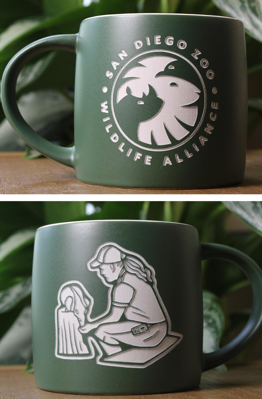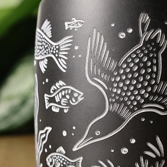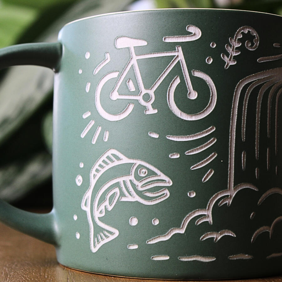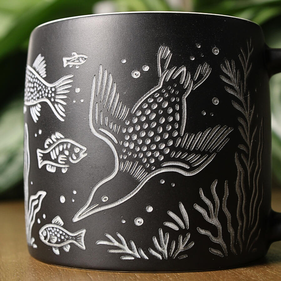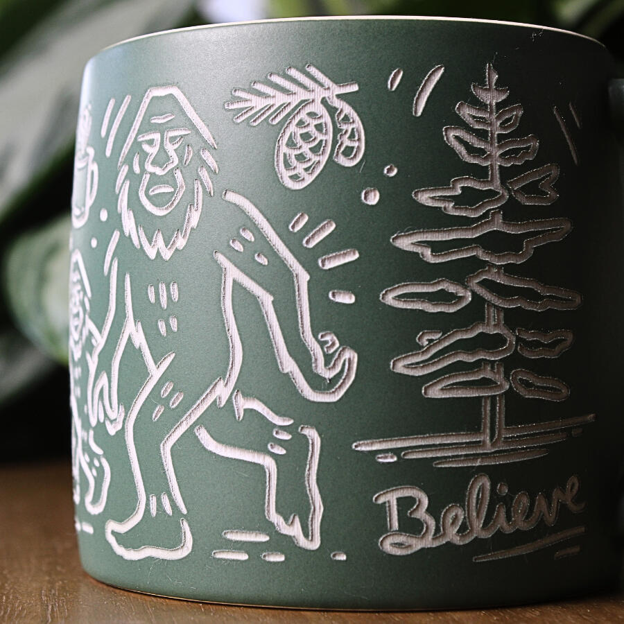 We offer two engraving styles: a black/dark brown finish, and a natural option where the glaze is removed to reveal the light-colored clay underneath. Color availability depends on the mug style and color.